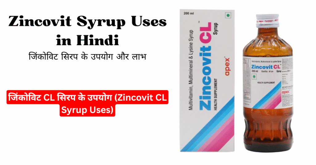 जिंकोविट सिरप (syrup zincovit) एक लोकप्रिय मल्टीविटामिन और मल्टीमिनरल सप्लीमेंट है, जो शरीर में आवश्यक पोषक तत्वों की कमी को पूरा करने के लिए उपयोग किया जाता है। यह बच्चों से लेकर वयस्कों तक के लिए एक प्रभावी टॉनिक है, जो इम्यूनिटी को बढ़ाने, त्वचा, बालों और नाखूनों के स्वास्थ्य को बेहतर करने, और समग्र स्वास्थ्य को बनाए रखने में मदद करता है। इस Post में हम जिंकोविट सिरप के उपयोग और लाभ (Zincovit Syrup Uses in Hindi, Zincovit Syrup Benefits, Zincovit Syrup Uses, Syrup Zincovit) के बारे में विस्तार से जानेंगे, साथ ही इसके अन्य पहलुओं जैसे कि जिंकोविट सिरप की कीमत, जिंकोविट सिरप की खुराक, जिंकोविट सिरप के साइड इफेक्ट्स, और जिंकोविट सिरप की संरचना पर भी चर्चा करेंगे।